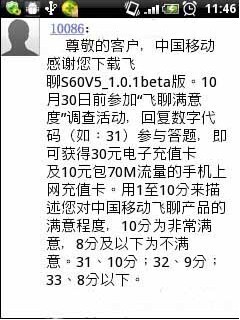 我勒了個去,中國移動就是有錢!今天,哥們下了一個可以通過流量聊天還可以語音聊天的飛聊(和微信功能差不多,不過好像流量使用要比微信省一半),沒想到剛下載完成就收到了一條移動的短信,手機截屏如下——